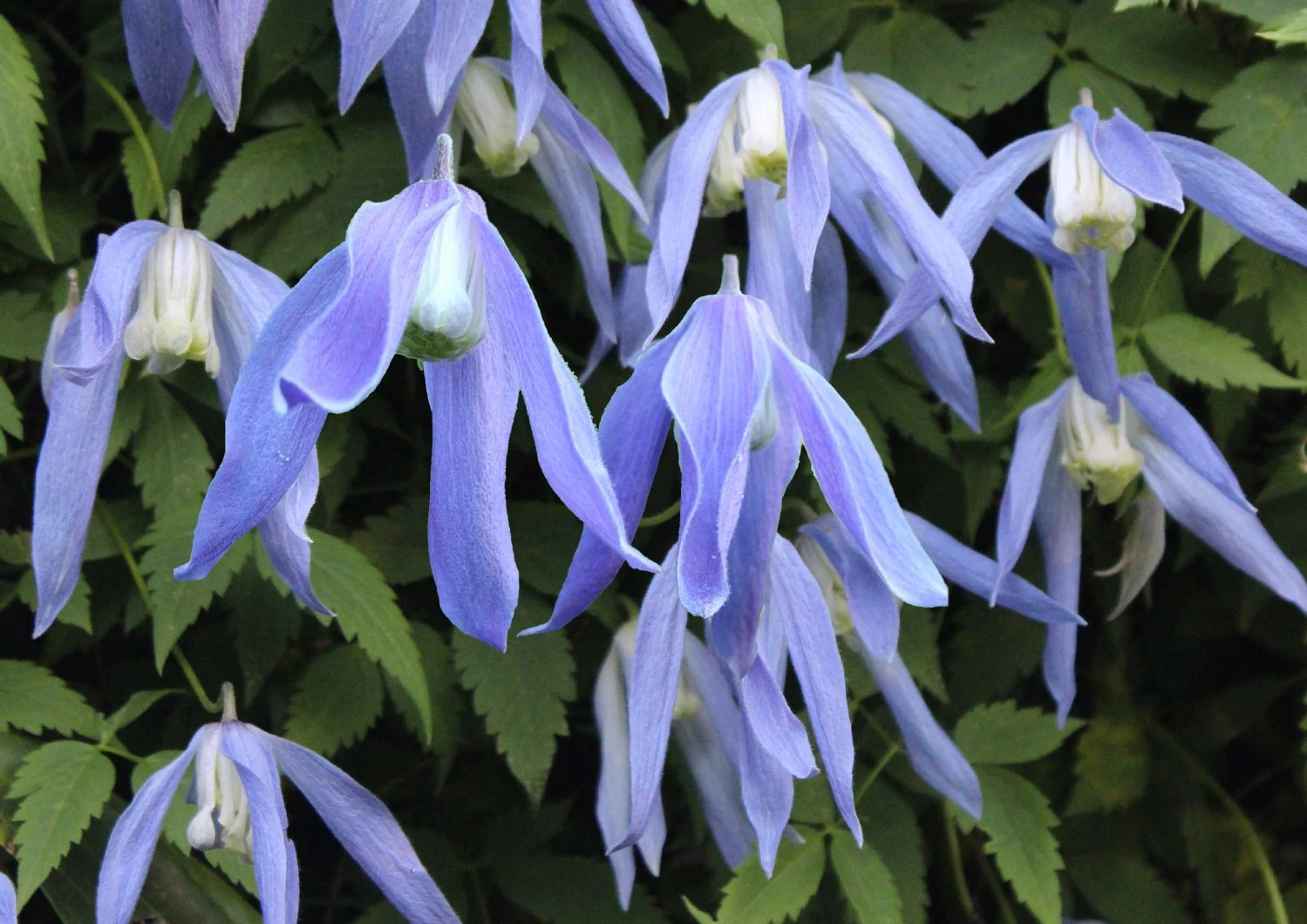 Clematis alpina ‘Frances Rivis’ ist eine wundervolle Sorte unter den Alpen-Waldreben. Sie blüht bereits ab April und besticht mit schlanken, lilablauen, nickenden Blüten. Sie eignet sich gut zur Begrünung von feingliedrigen Zäunen oder Pergolen und lässt sich durch ihren gemäßigten Wuchs von 3 m Höhe gut bändigen.