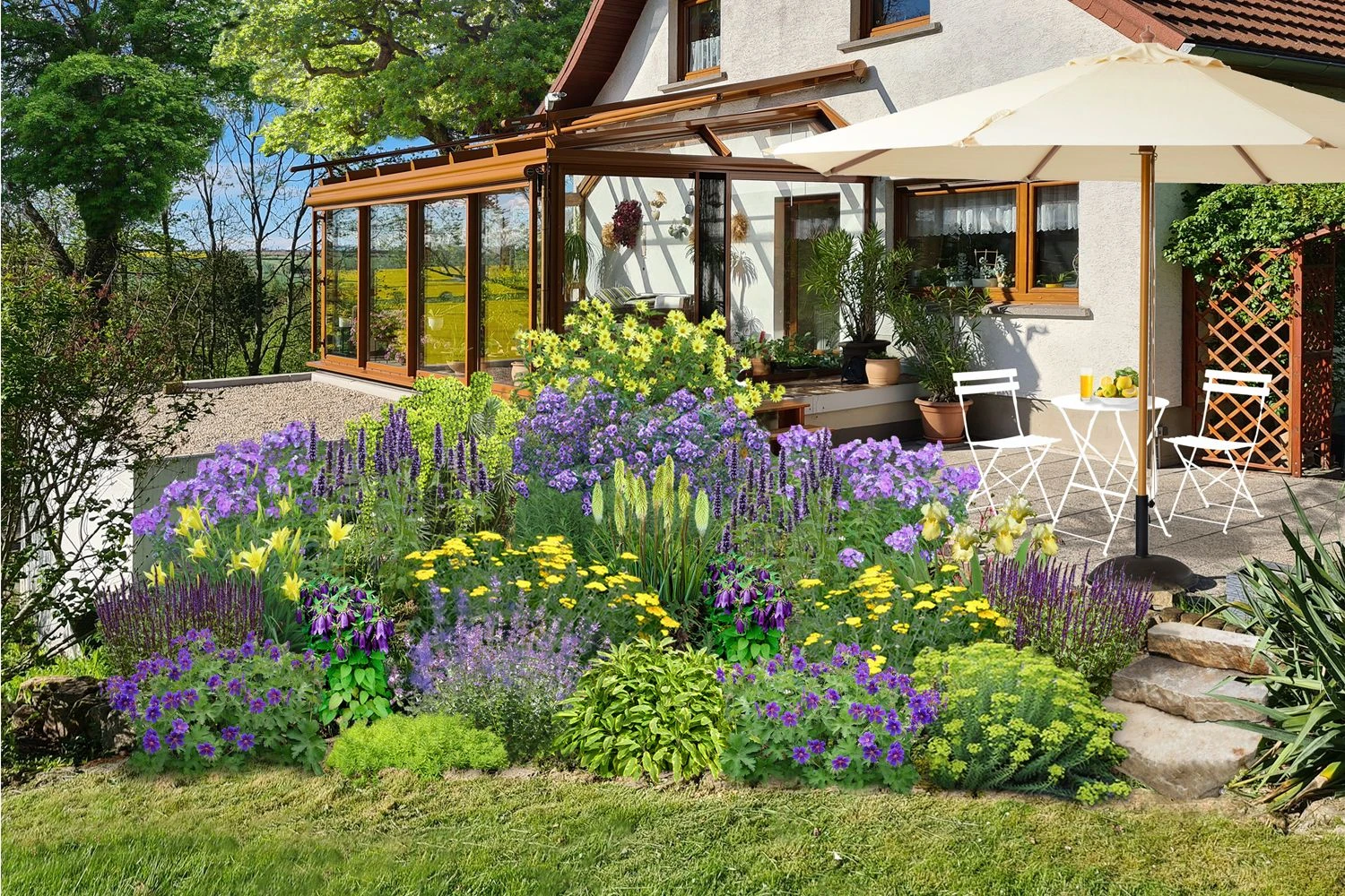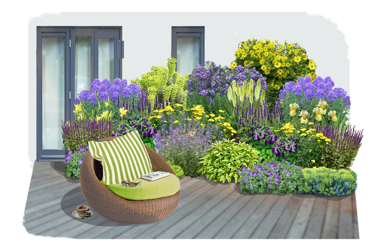 Ausdrucksstarkes Lila und leuchtende gelb-grün Töne sorgen für einen anregenden Farbkontrast in dieser Rabatte, die von Frühsommer bis Spätherbst blüht. Alle Stauden in diesem Beet gedeihen bestens in voller Sonne und machen dieses Ensemble zu einem idealen Kandidaten für die ansprechende Umpflanzung einer Terrasse oder eines Sitzplatzes.