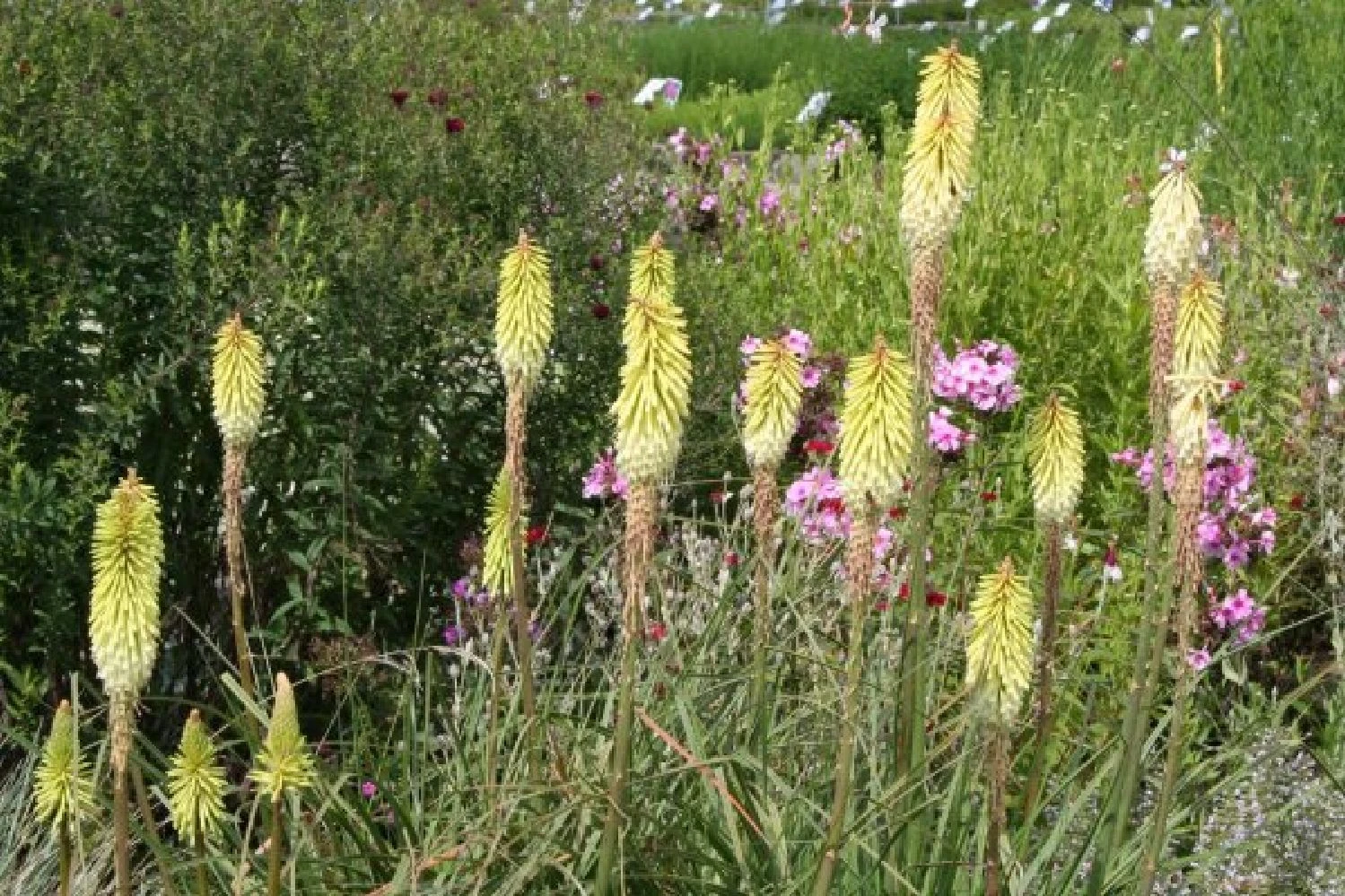 Selbst den Winter hindurch erfreut das Beet durch die immergrünen Wolfsmilchgewächse, gelb-grüne Fetthenne und panaschierten Salbei. Auch Freunde von duftenden Pflanzen kommen bei diesem Beet auf ihre Kosten dank wundervoller Bartiris, Duftnessel, Phlox und Ziersalbei.