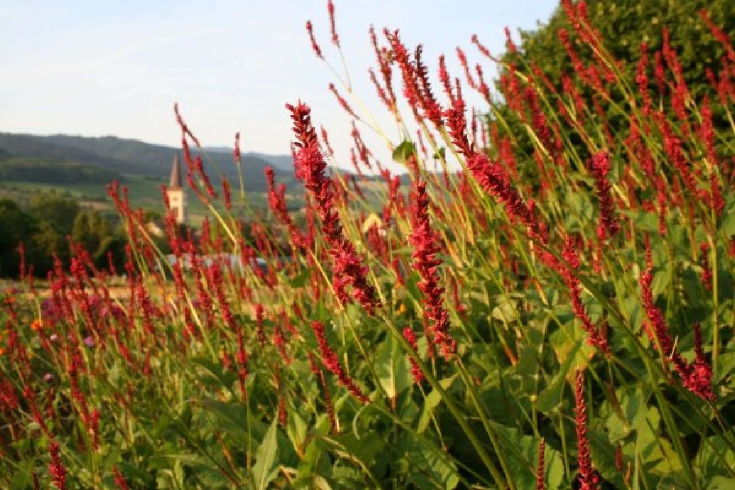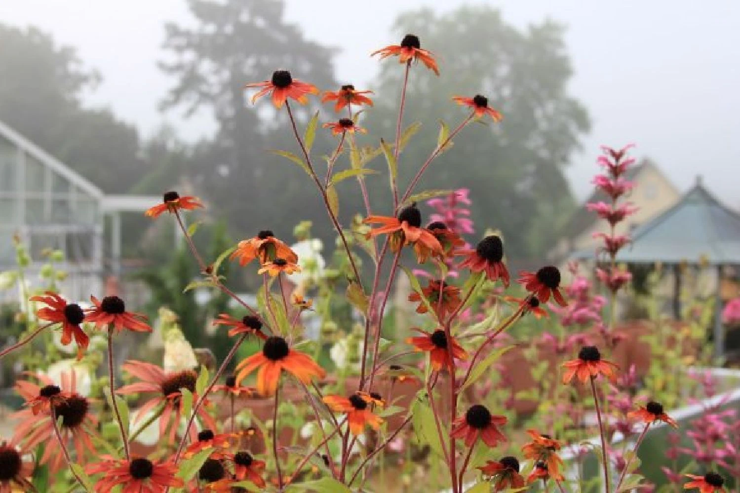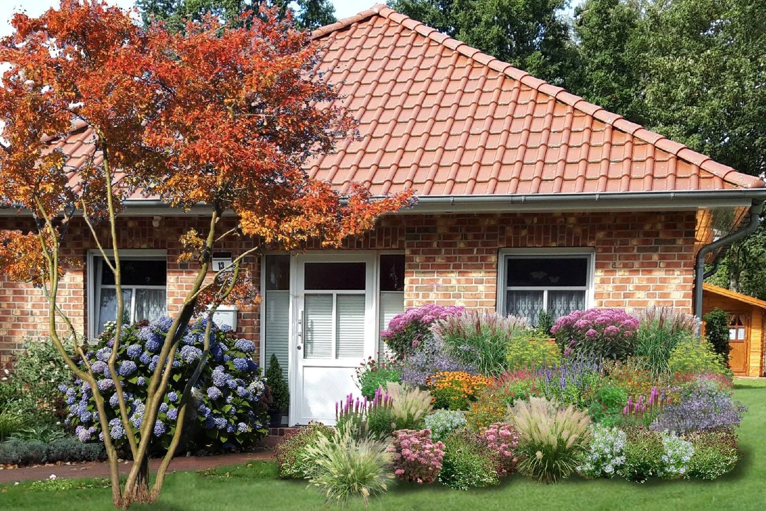 Zartlila Amsonie, leuchtstarker Scheinsonnenhut und kleiner Wiesenknopf eröffnen die Blühsaison vorm Haus. Dazu gesellen sich in rascher Abfolge Duftnessel, Kerzenknöterich, Fenchel, Knautie, Sonnenhut, Fetthenne und eine zarte Herbstaster. Kräftiger, rosa Wasserdost sorgt im Hintergrund des Beetes zusammen mit zwei herrlichen Chinaschilf für Höhe und verleiht der Pflanzung optisches Gewicht. Ab Spätsommer zeigen dann auch die kleineren Gräser wie Diamantgras und Lampenputzergras was in ihnen steckt, wenn sie ihre zarten Blütenstände präsentieren. Im Frühherbst gibt es dabei nichts Schöneres, als an einem kühlen, sonnigen Morgen die Tautropfen in diesen Gräsern funkeln zu sehen.