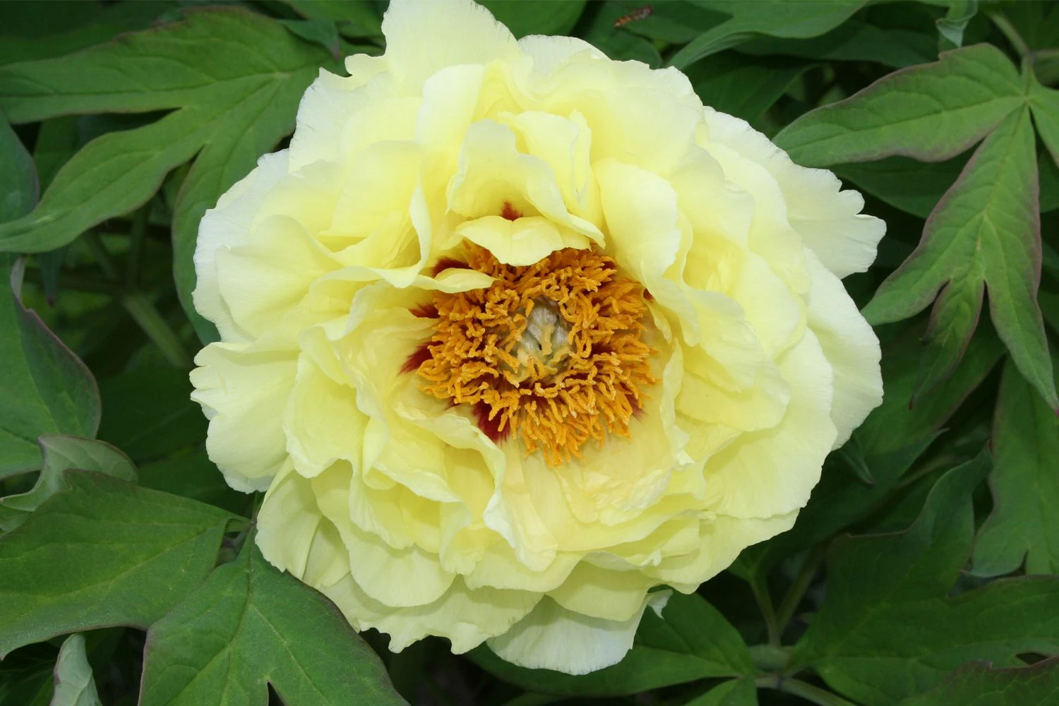 Diese aus Japan stammende Strauchpfingstrose lässt den Garten erstrahlen, wenn sich Ende Mai ihre riesigen Blüten öffnen, die bis zu 25 cm im Durchmesser erreichen können. Die Blütenfarbe von Paeonia lutea ‘Oukan’ spielt dabei von hellgelb im Aufblühen bis hin zu Cremefarben im Verblühen. Die Blüten sind halbgefüllt und zeigen in der Mitte weinrote Basalflecken.