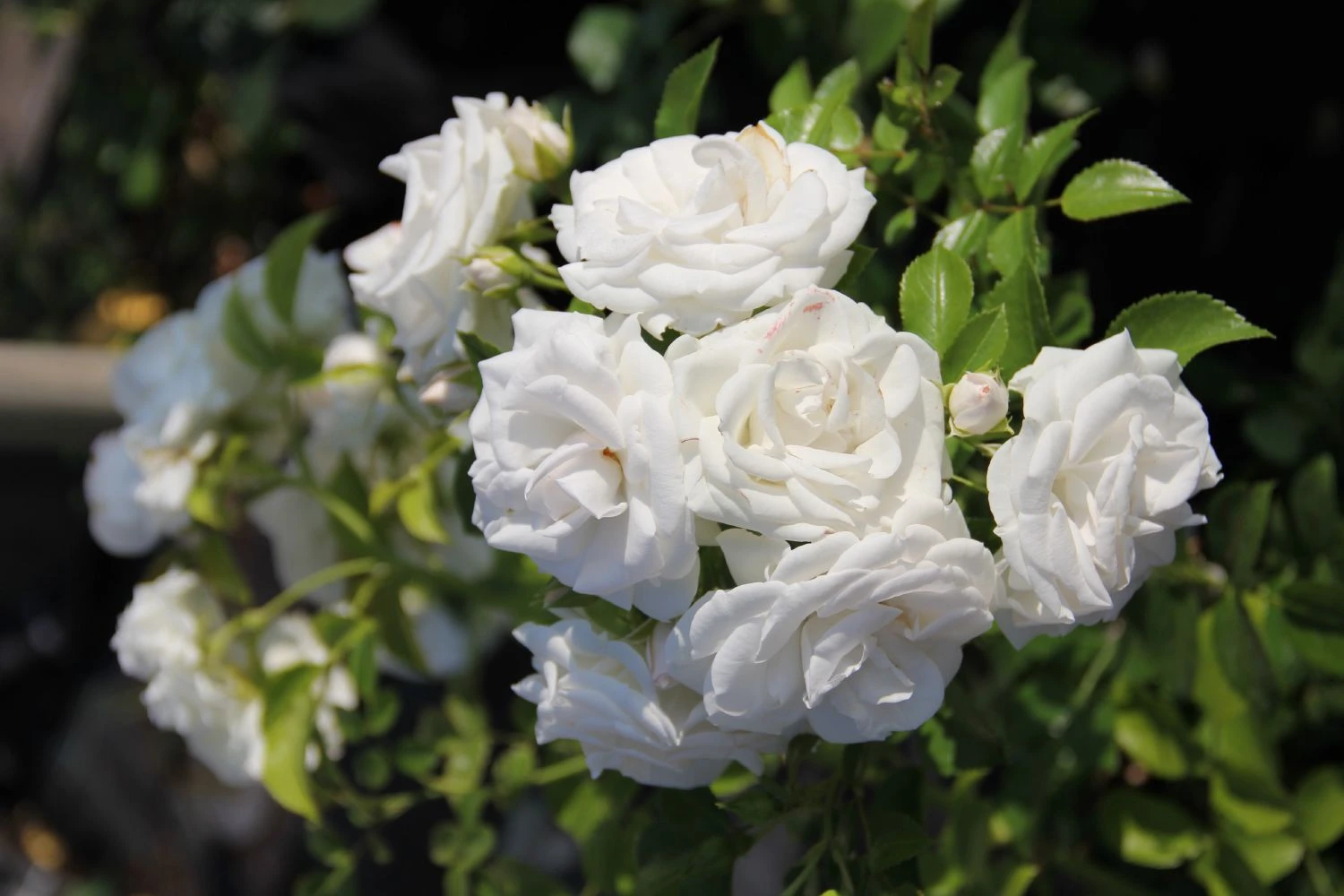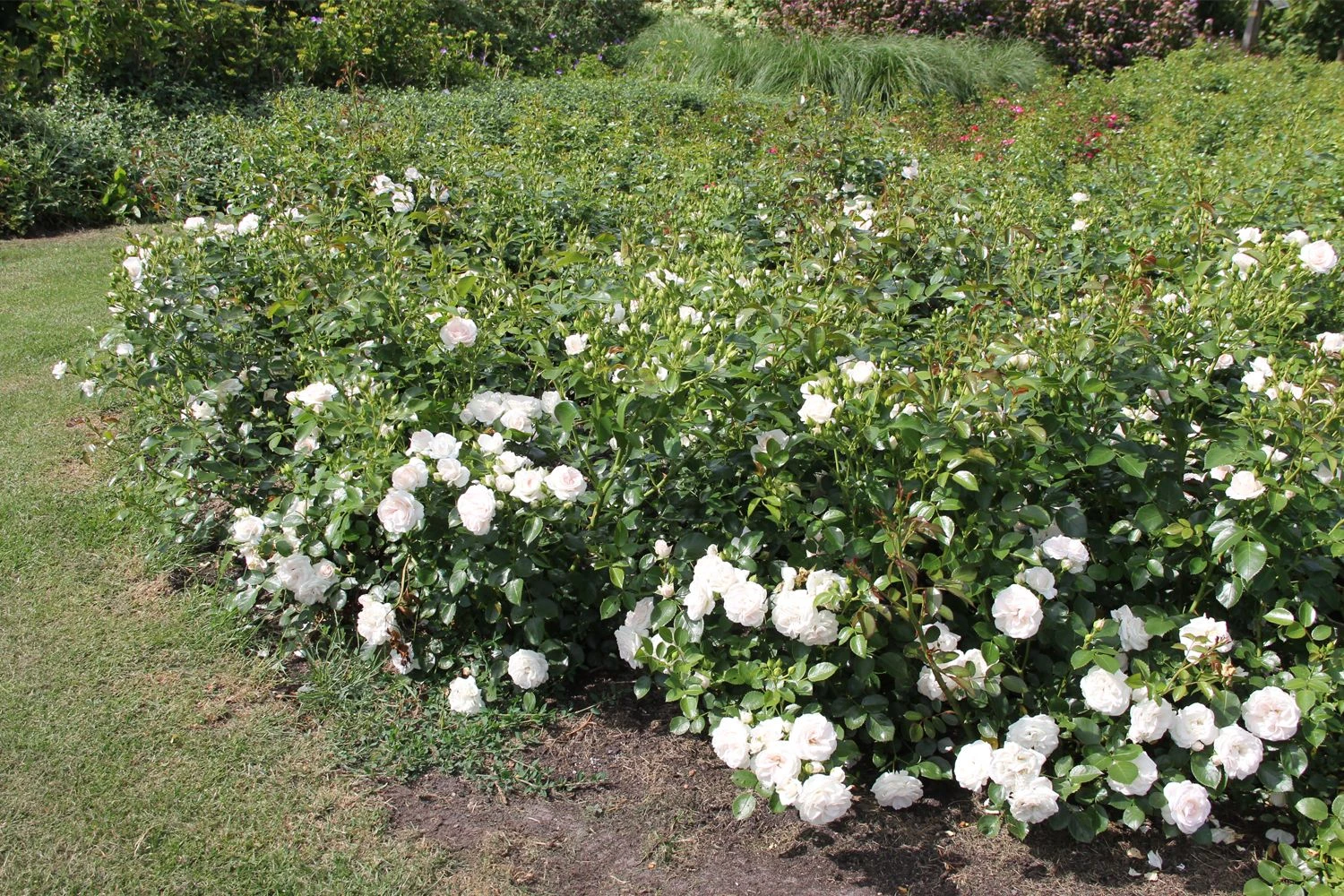 Die Rose ‘Aspirin-Rose’ ist eine weiße Bodendeckerrose und changiert bei kühler Witterung romantisch ins Rosé.