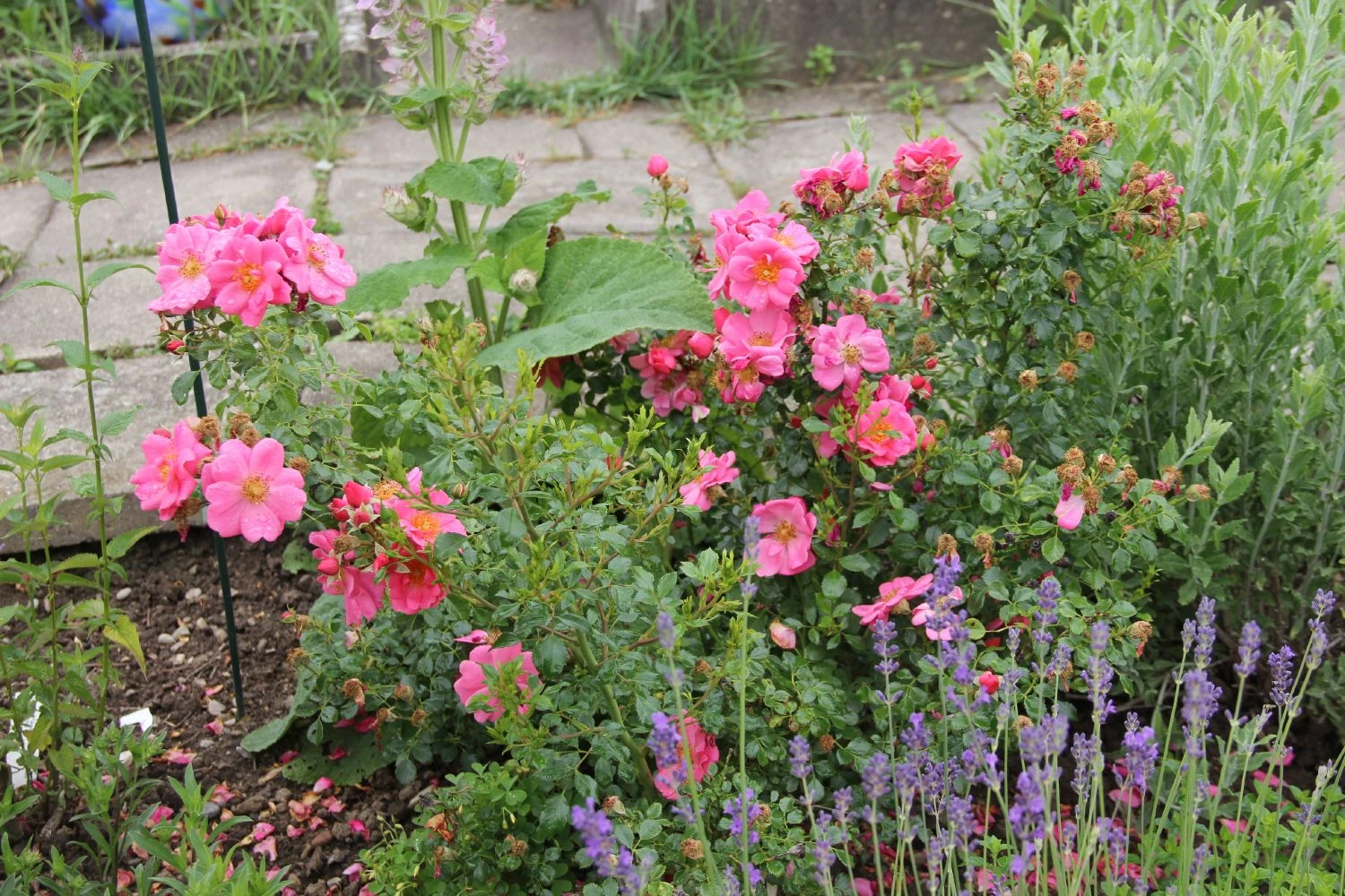 Die Rose ‘Bienenweide’ in rosa hat einen intensiven Blütenflor mit reicher Nachblüte. Diese Rose ist öfterblühend, sehr robust und gesund.