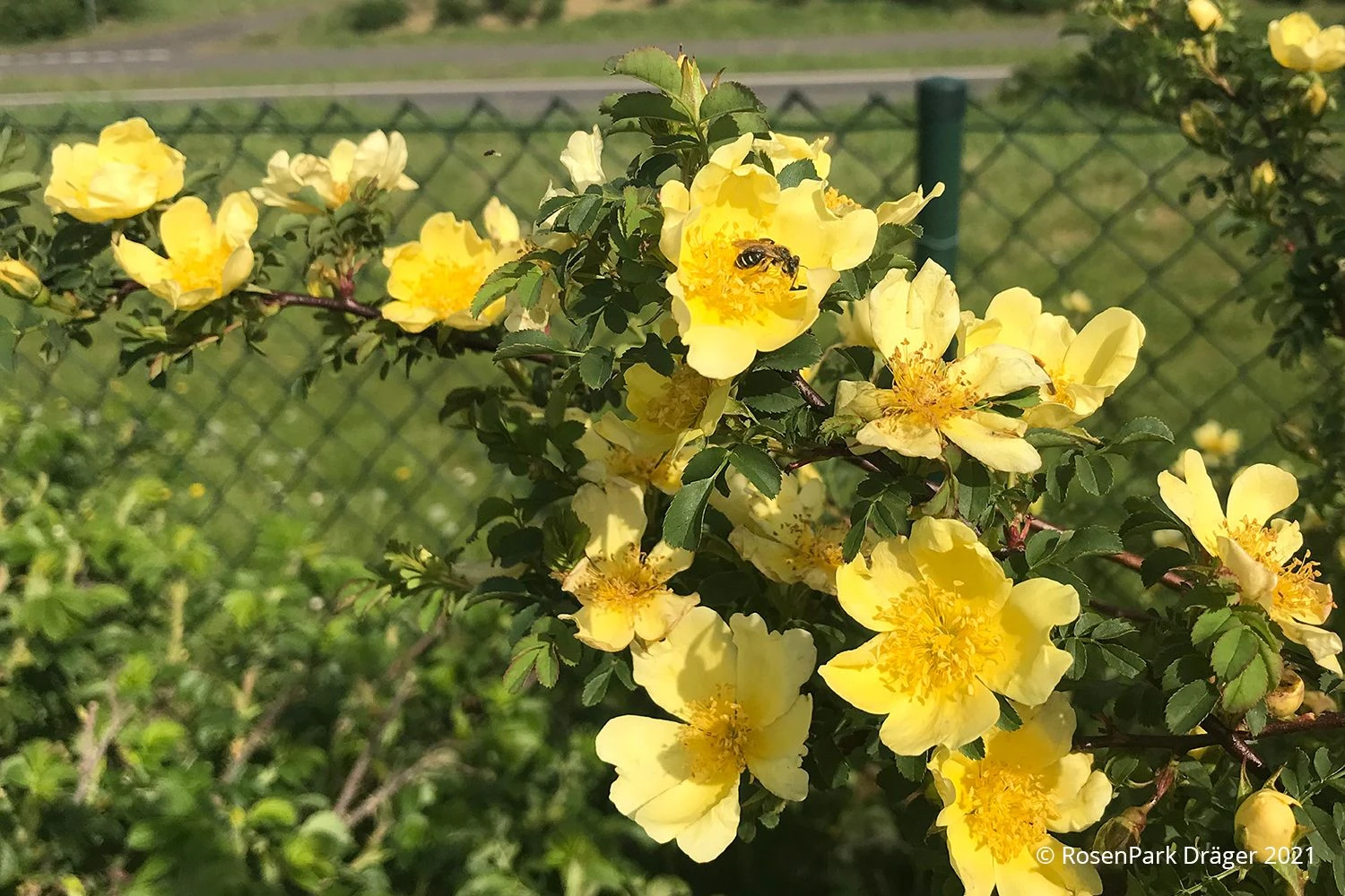 Kaum haben sich die Blüten geöffnet, beginnt es an dieser Rose schon zu summen, denn die offenen Blütenschalen ziehen Bienen und Hummeln magisch an. Im Herbst darf man sich dann als Folge all der Flugaktivität auf attraktive, weinrote, kugelige Hagebutten freuen. Doch nicht nur Blüten und Früchte machen den Zierwert dieser Wildrose aus. Auch das feingeteilte, kleine Laub von Rose hugonis ist äußerst attraktiv und erinnert im Aussehen an Akazien.