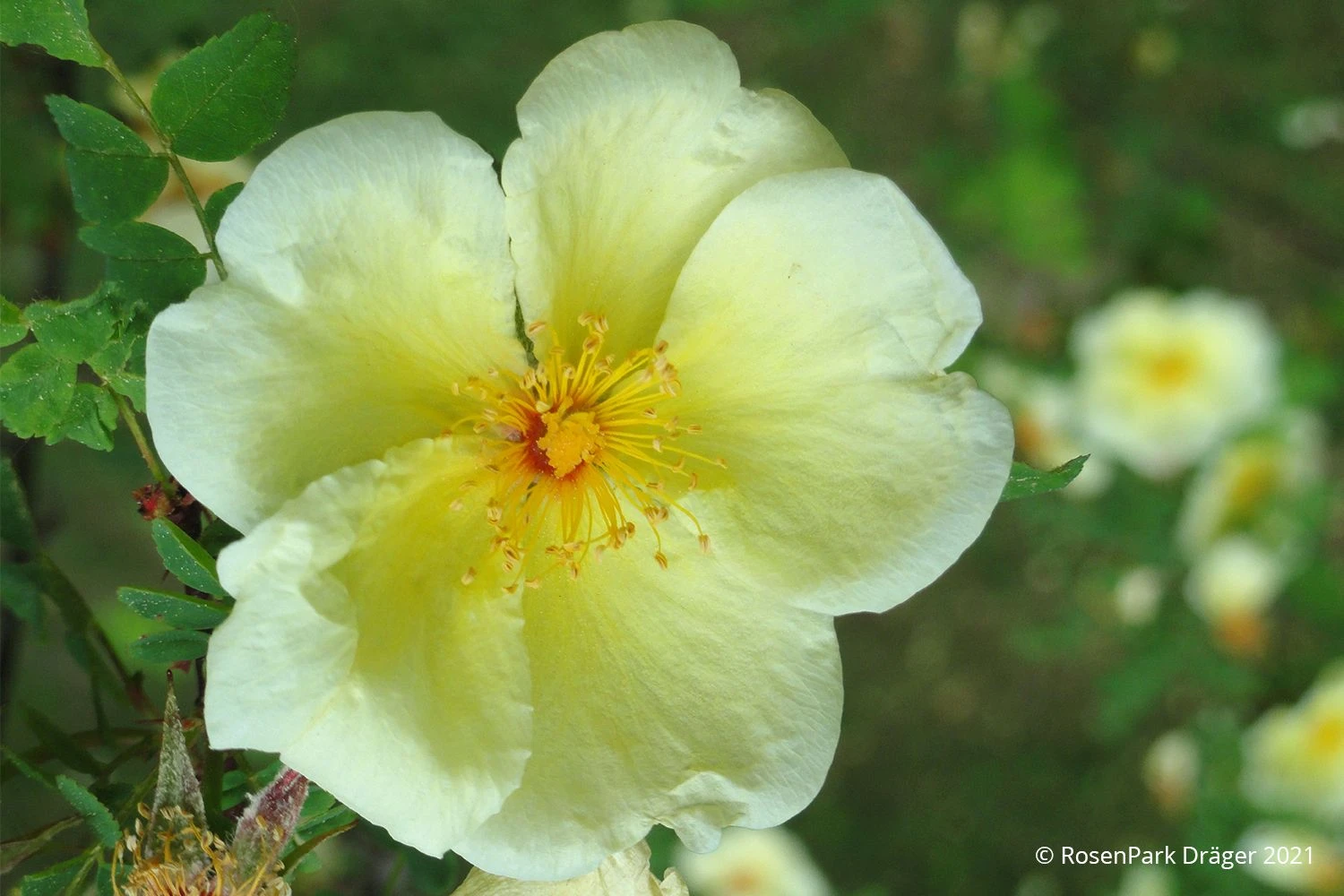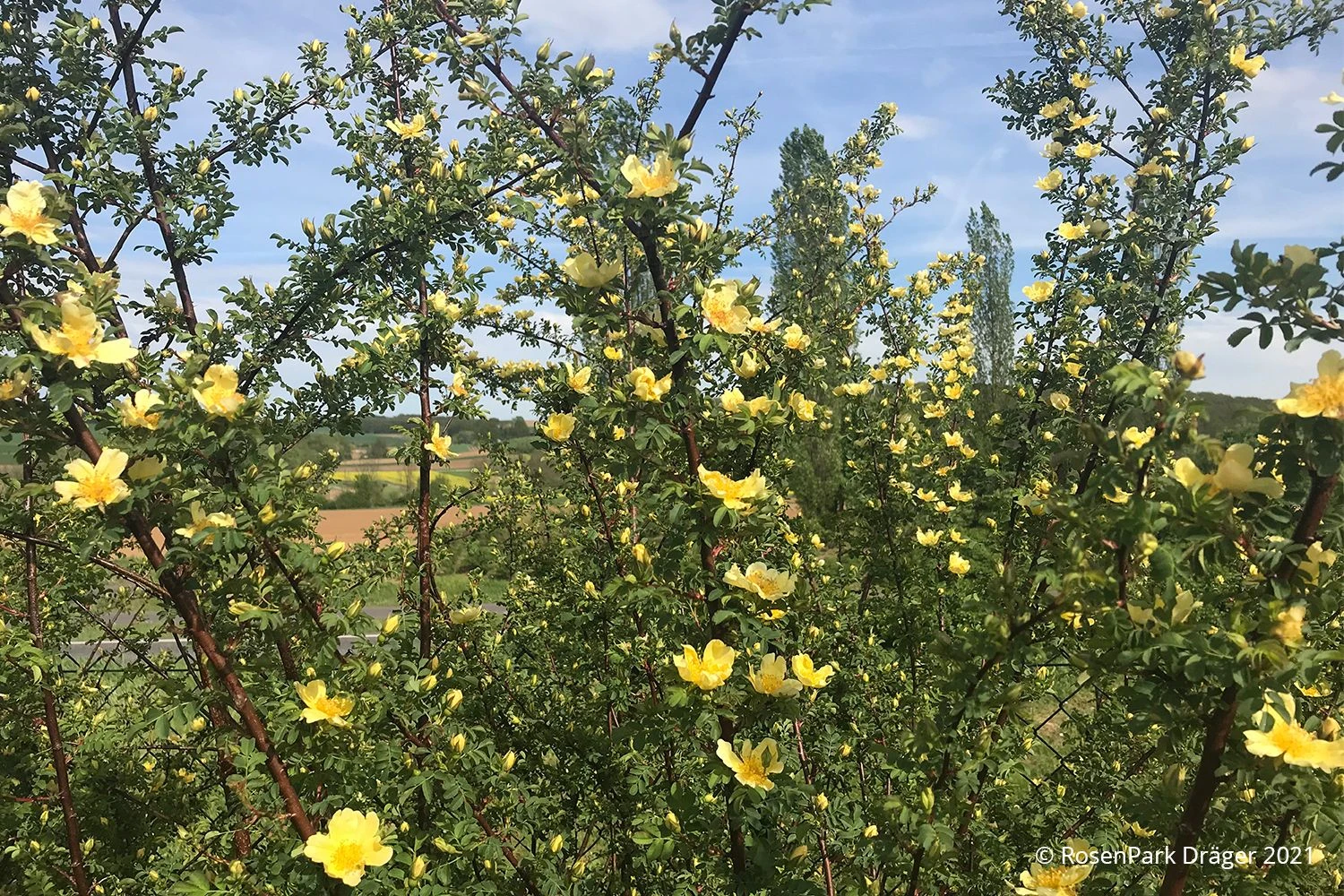 Ein atemberaubender Hingucker ist die Chinesische Goldrose, wenn sie bereits ab Anfang Juni eine Vielzahl einfacher, hellgelber Blüten zur Schau trägt. Rose hugonis bildet dabei stattliche Sträucher, so dass man sie idealerweise an Stellen im Garten pflanzt, an denen sie als Solitär voll zur Geltung kommen kann.