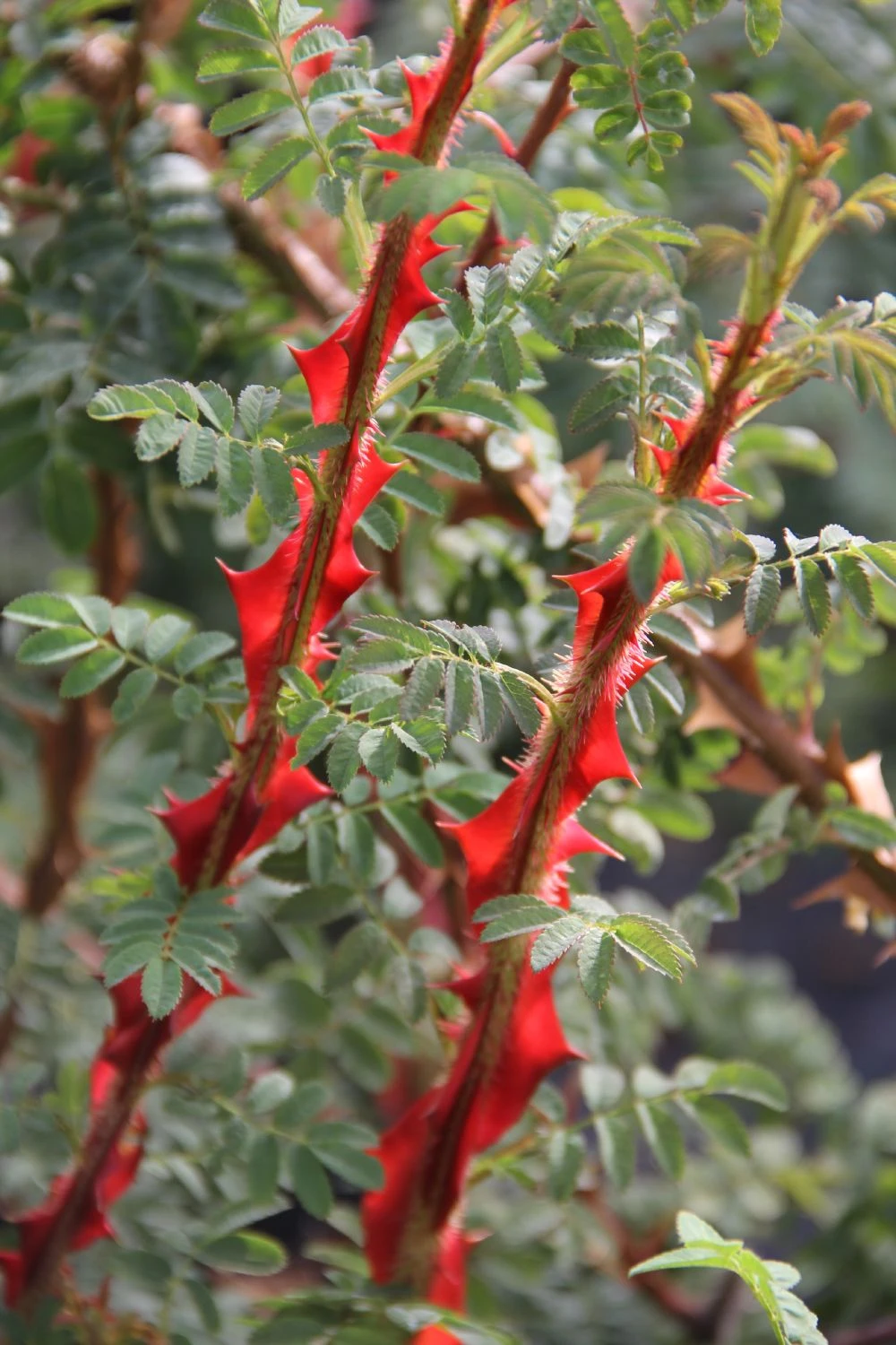 Die Rose omeiensis pteracantha (auch Stacheldrahtrose oder Wildrose genannt) ist reinweiß, einfach und leicht duftend.