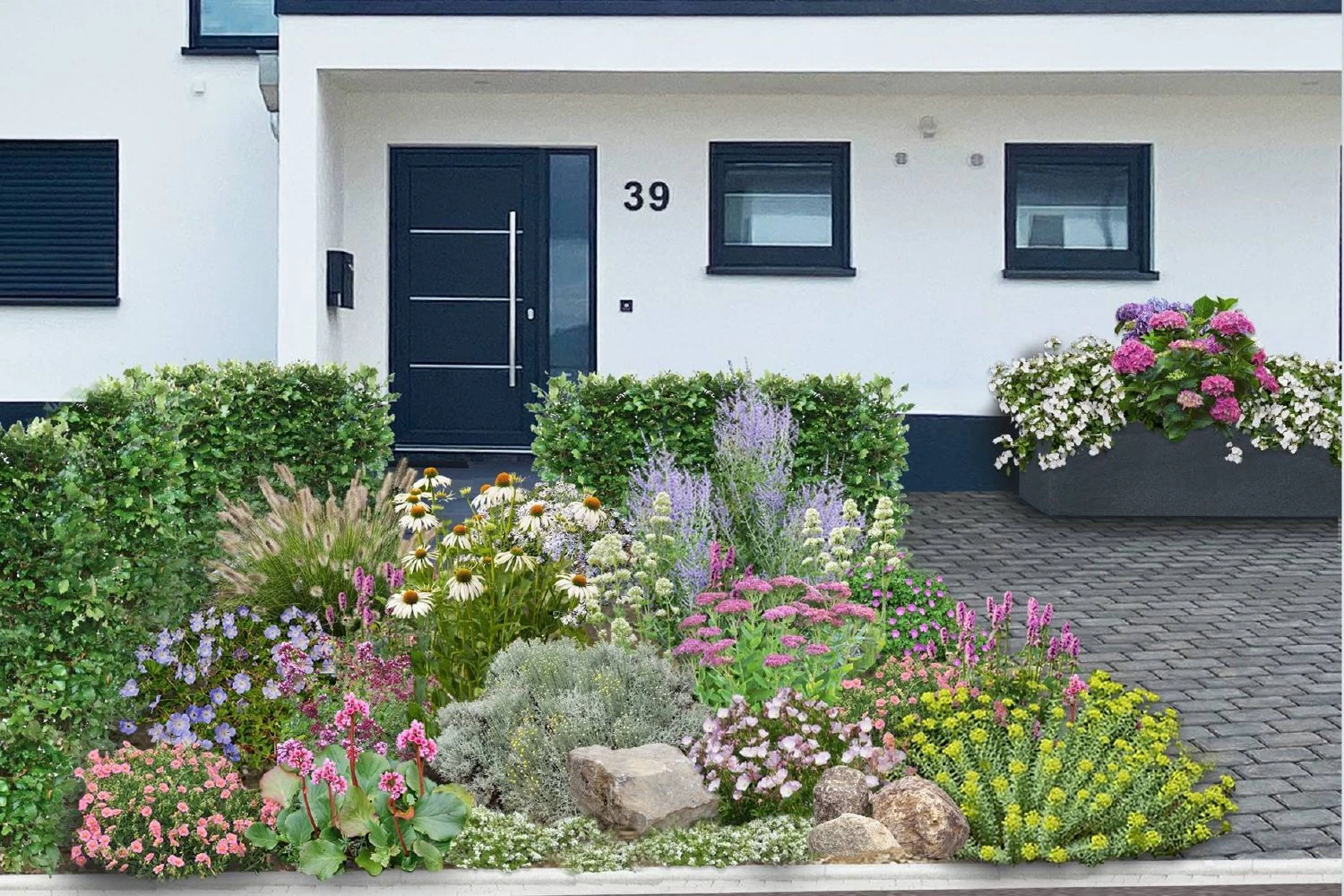 Für sonnige Vorgärten ist die Kollektion “Sonniges Willkommen” ideal, um einen Hauch Mittelmeerstimmung zu verbreiten. Die Blütezeit reicht ebenfalls von März bis zum Spätherbst, im Winter bleibt das Beet durch immergrüne Strukturpflanzen wie Russischer Lavendel, Sonnenröschen und Bergenien ansprechend. Mit der Kombination aus leuchtenden, bunten Blüten, silberlaubigen und duftenden Pflanzen entsteht ein fröhlicher und lebendiger Vorgarten mit mediterranem Charme.